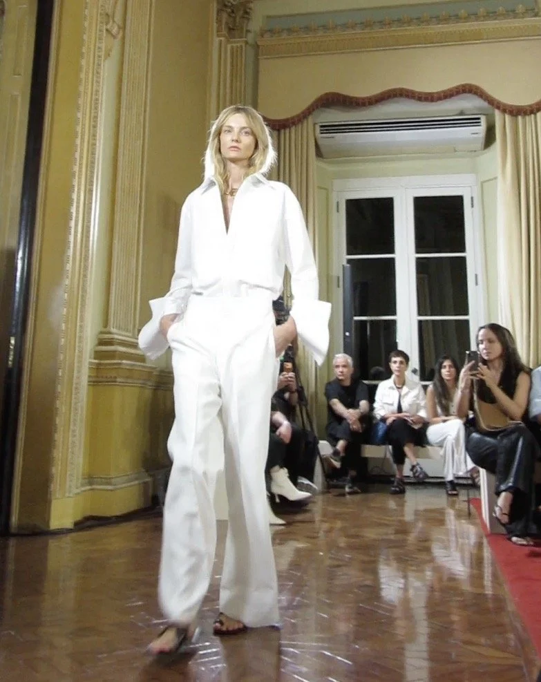 O primeiro look do desfile são as três peças que usaria pelo resto da minha vida se só pudesse usar três peças eternamente