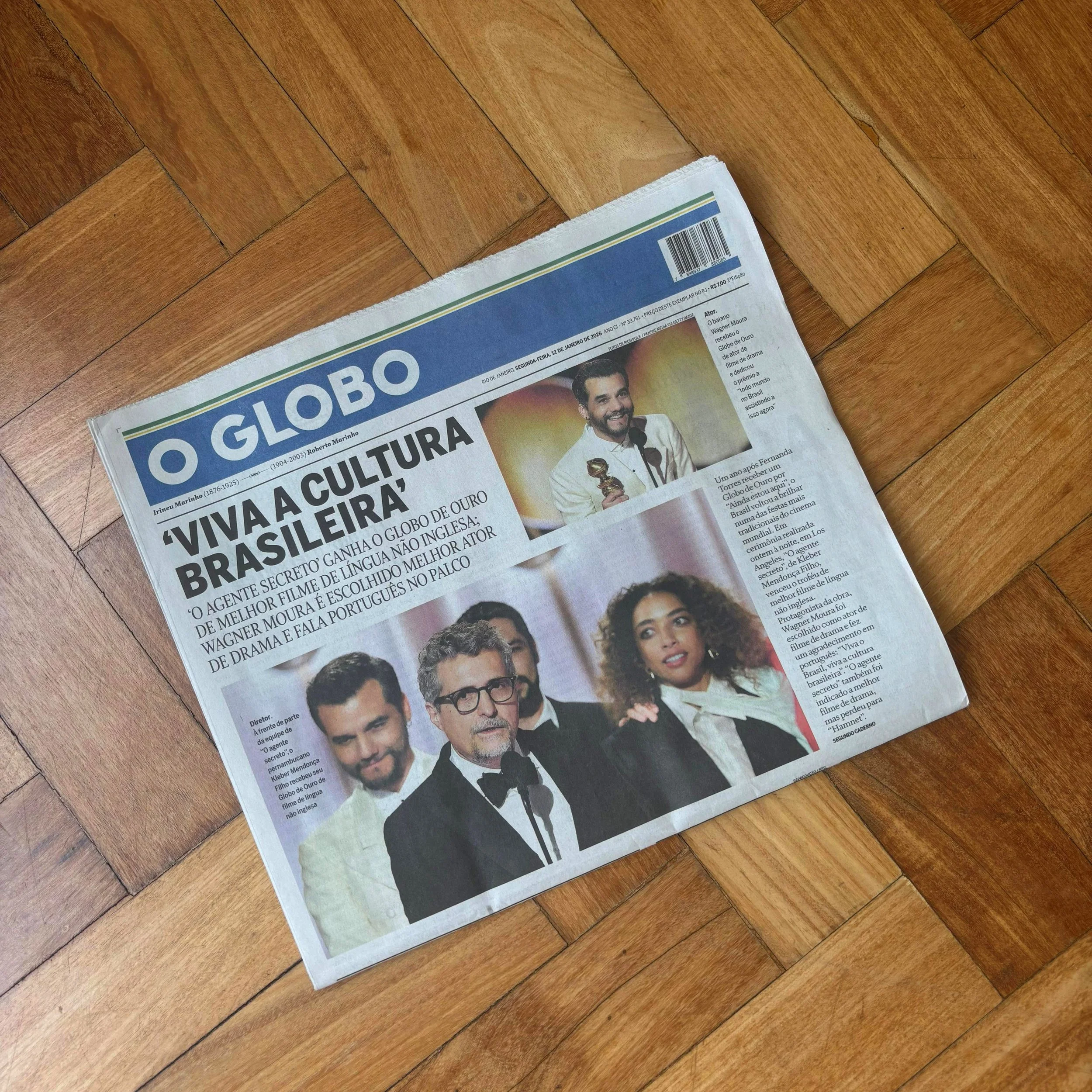 Capa do jornal O Globo de 12 de janeiro de 2026. Na noite anterior, o Globo de Ouro premiou Melhor Filme Estrangeiro para O Agente Secreto e Melhor Ator em Filme Dramático para Wagner Moura, que interpreta Marcelo/Armando no longa.